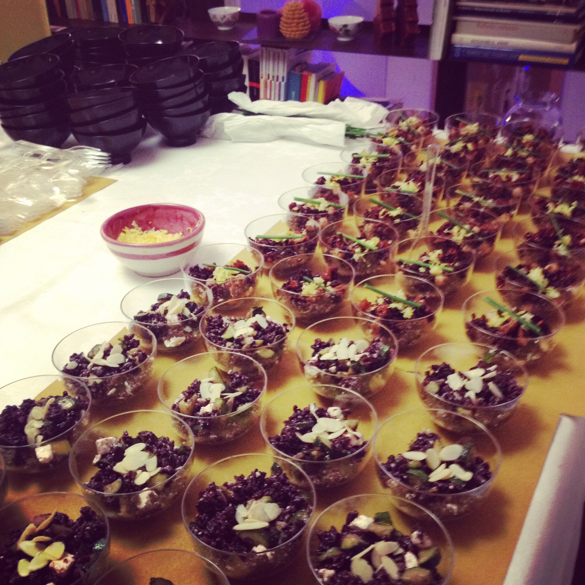 Gli invitati si affollano intorno a mini coppette con due versioni di riso venere (una con pomodori secchi, ceci e limone e l’altra con zucchine saltate, feta, mandorle e menta) e una gustosa zuppa con fagioli, ceci e lenticchie. A corredo, bocconcini di pizza bianca farcita con mortazza (e una goccia di balsamico) e prosciutto e fichi. Fiumi di vino bianco e un dj d’eccezione…grande serata!