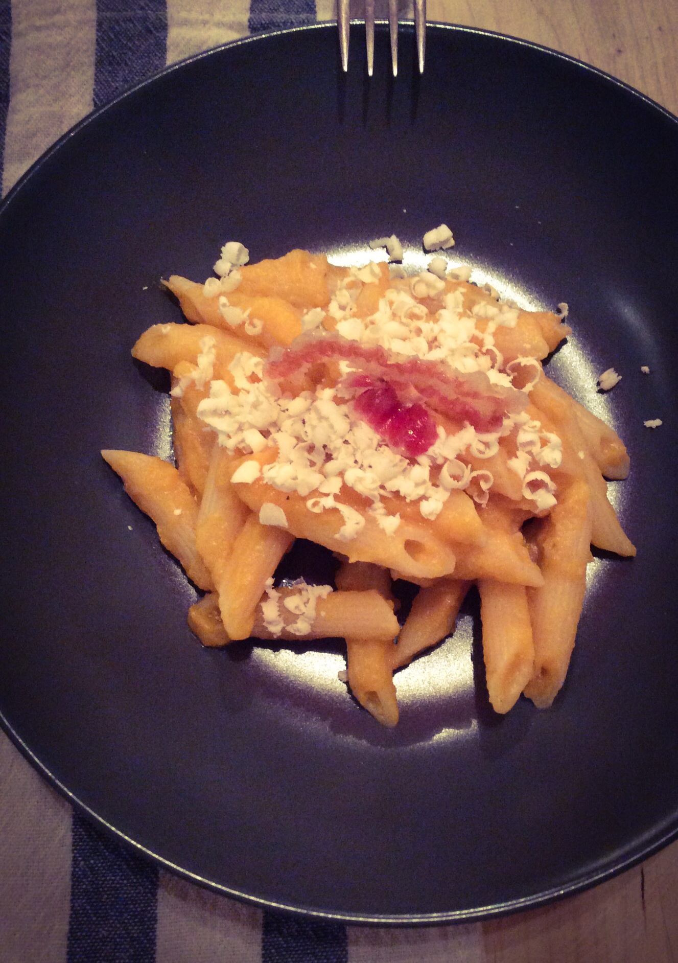 Per stasera, pasta con crema di zucca al te’ affumicato con ricotta salata e pancetta croccante