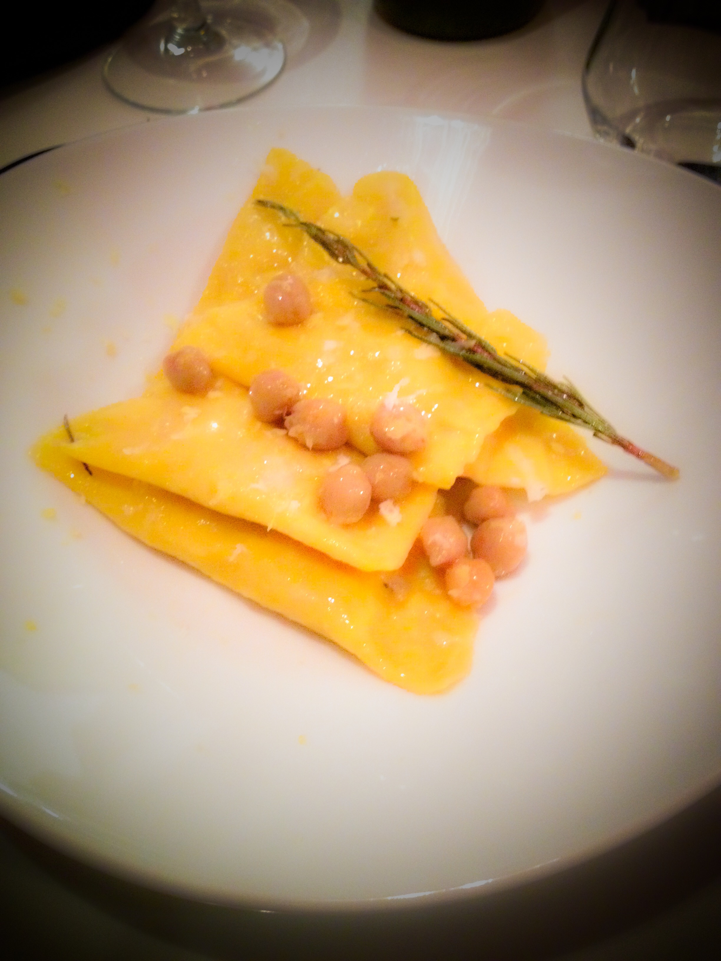 Stendo la pasta, metto il ripieno in un sac a poche, lo suddivido, taglio la pasta a quadrati o rotondi e sigillo. Dopo aver cotto i ravioli in acqua bollente con un goccio d’olio d’oliva, il ripasso in padella con burro e rosmarino, la manciata di ceci e una spolverata di buccia grattugiata di limone.