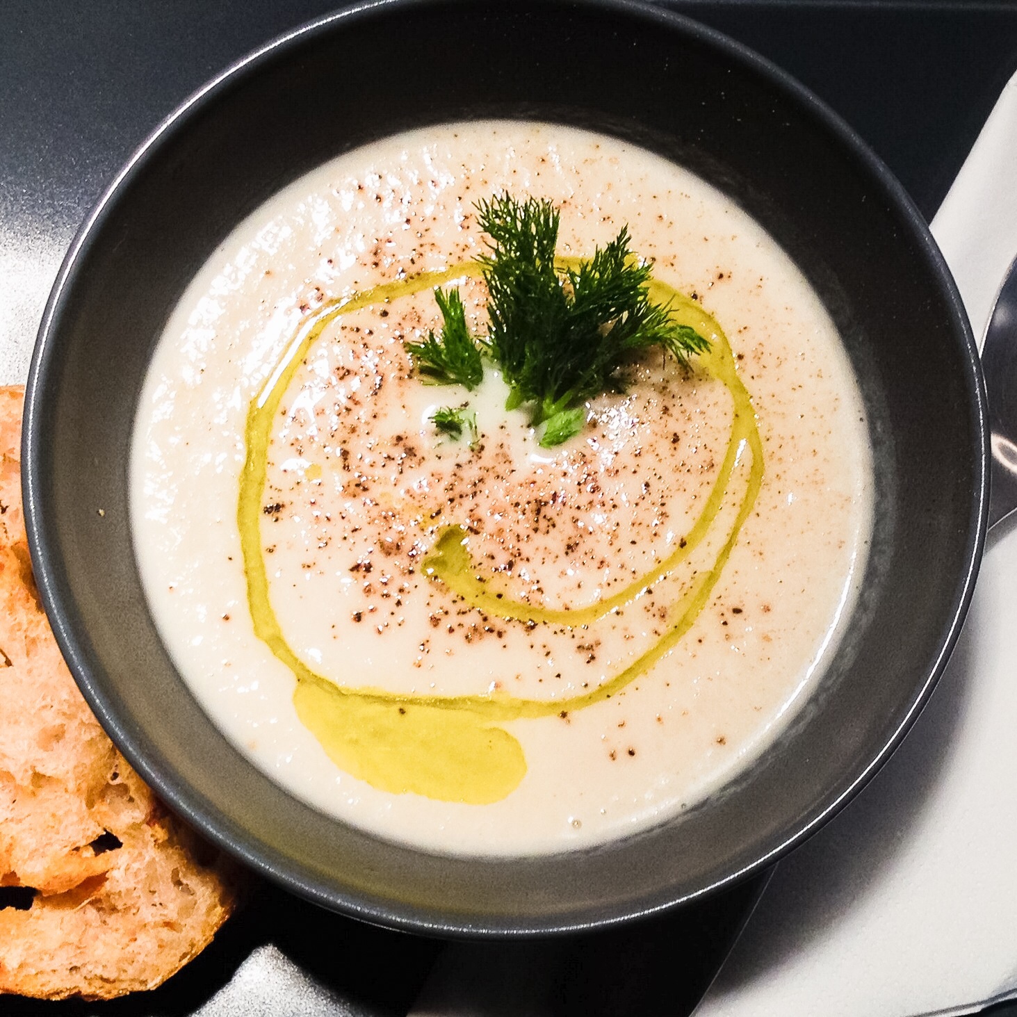 In una pentola faccio un soffritto con uno spicchio d’aglio e un paio di acciughe. Un volta sciolte, aggiungo il finocchio a pezzi e un mezzo bicchiere d’acqua calda. Una volta ammorbiditi, frullo il tutto, ottenendo una crema morbida. Una spolverata di pepe e un goccio d’olio per concludere.