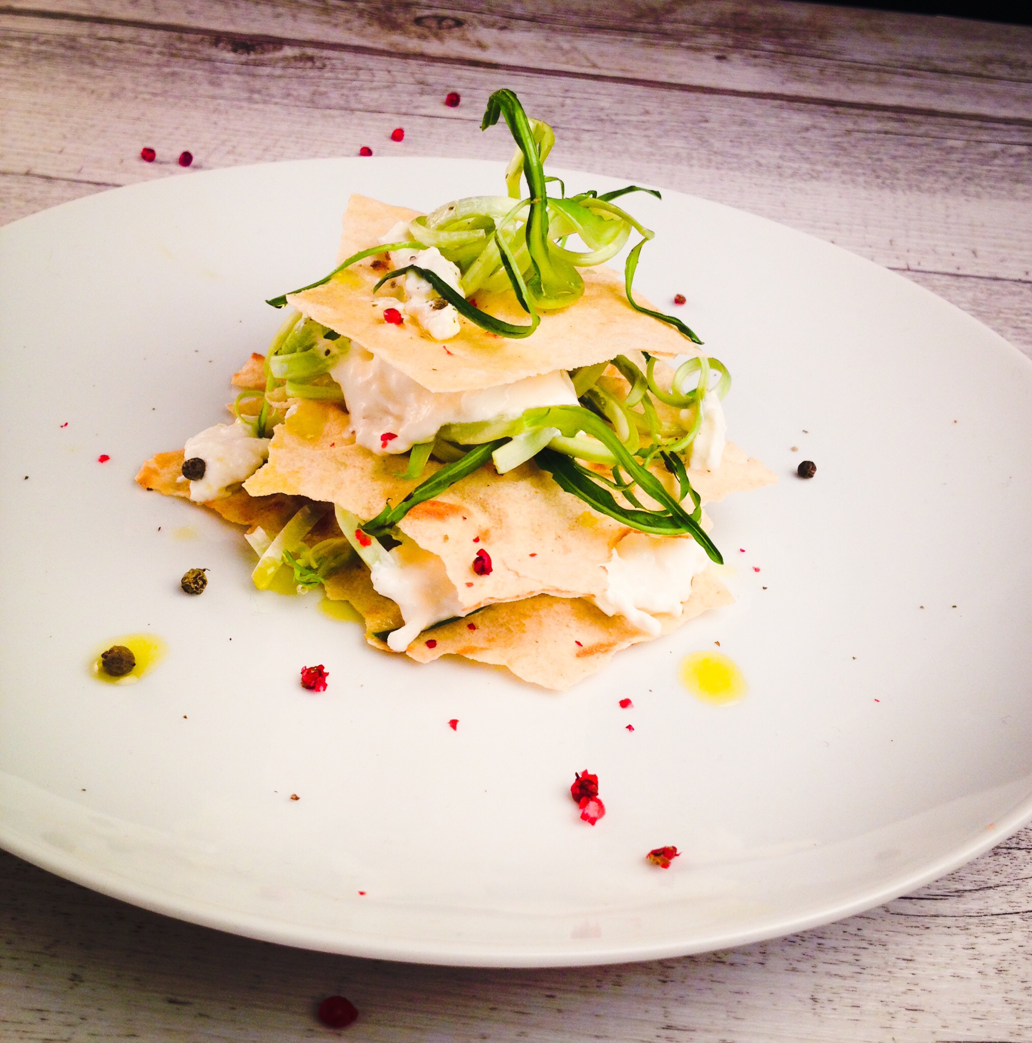 A questo punto, creo la millefoglie alternando una sfoglia di pane carasau, una manciata di puntarelle, aggiungo la stracciatella, un giro di pepe, e ricomincio con un altro strato di carasau. In questo caso ho aggiunto dei pomodorini ciliegino secchi per dare un tocco di colore, ma viene ugualmente bene finire con delle alici sott’olio o addirittura marinate. Il numero di ‘piani’ di millefoglie dipende dalla vostra pazienza e dal grado di fame degli invitati!